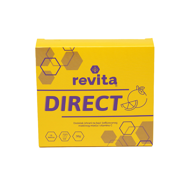 Revita Direct, a powder for direct oral use, is a dietary supplement based on royal jelly and vitamin C, with an orange flavor.